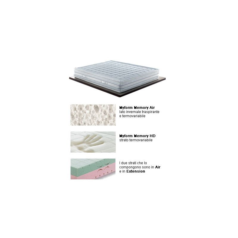 Mentre sul lato estivo il materasso è in Myform Air, traspirante , che favorisce la dispersione dell'umidità e mantiene ventilato il materasso, nella parte centrale troviamo un supporto in Myform Extension, che sostiene adeguatamente il nostro corpo.