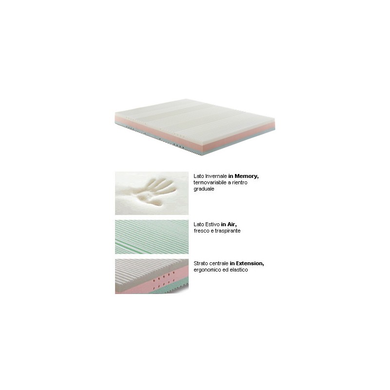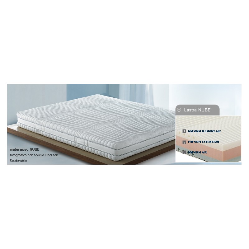 Nel materasso viscoelastico Nube, la lastra è costituita dalla combinazione delle tre varianti del Myform, che abbinate tra loro offrono unsostegno ineguagliabile e personalizzato. Il lato estivo è in Air, fresco e traspirante; lo strato centrale in Extension, ergonomico ed elastico e lo strato invernale in Memory Air, areato e termovariabile che favorisce la distribuzione omogenea del peso corporeo.