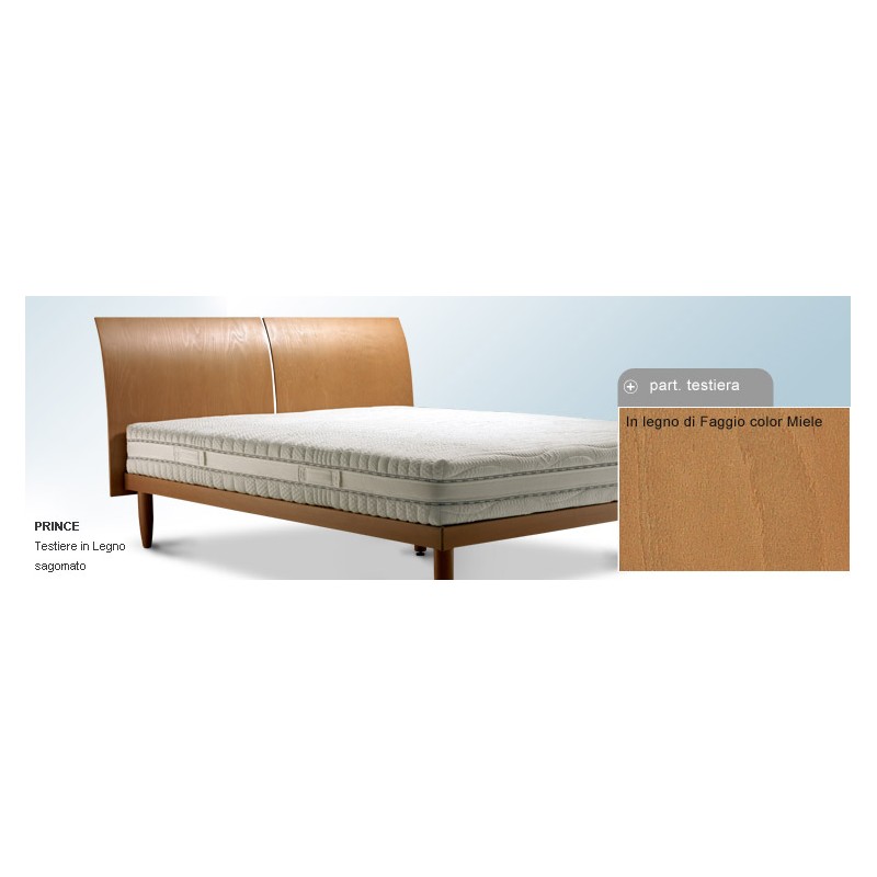 Prince è in legno di faggio sagomato ad alta frequenza, di color miele, agganciata alla rete con uno speciale innesto discreto e robusto. Il programma prevede tre diverse misure base che possono essere affiancate nelle versioni matrimoniali.