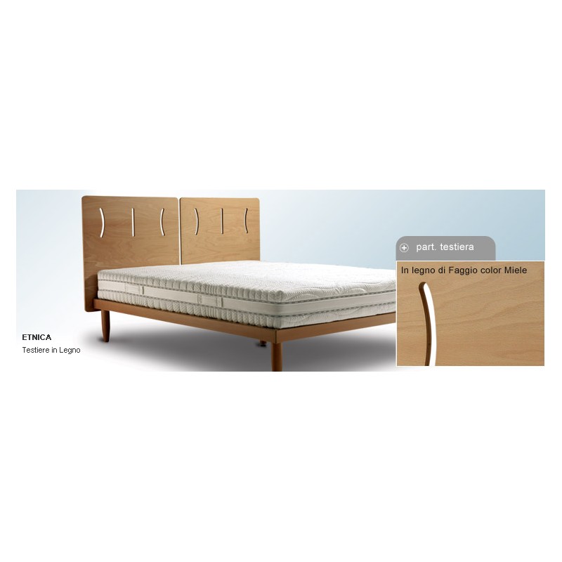 Etnica è in legno di faggio, di color miele, agganciata alla rete con uno speciale innesto discreto e robusto. Le testiere senza curvatura possono essere accostate completamente al muro e di recuperare al massimo lo spazio.